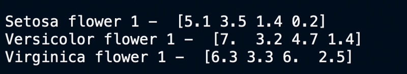 print("Virginica flower 1 - ",iris.data[100],"\n")