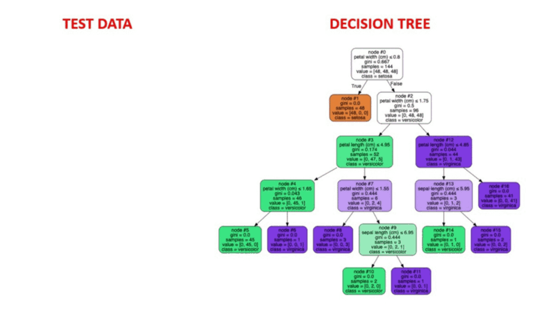 Take a look at an actual test row being run through a decision tree. The example row in question is Row 100 of the class Virginica.