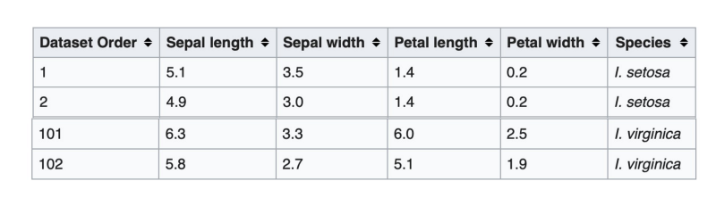 Wikipedia mentions the complete details of the data set. One can go over there and study the dataset in depth. All we need to start coding is that there are 150 rows in the dataset, 50 per type of iris.