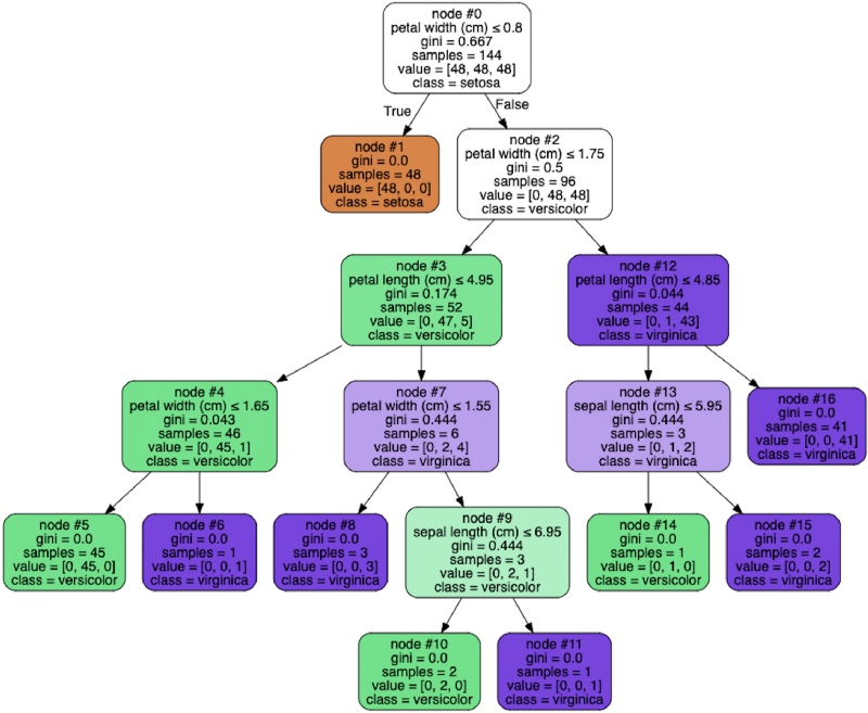 graph.render('dtree_render',view=True)Observe how at each node of the tree one has to make a decision and then move left or right based on the answer. Node 0 checks whether petal width is ≤ 0.8 cm. If that is true the flower is cateogrized as a Setosa right away. Otherwise, we go to node 2 and check if petal width ≤ 1.75cm and so on.